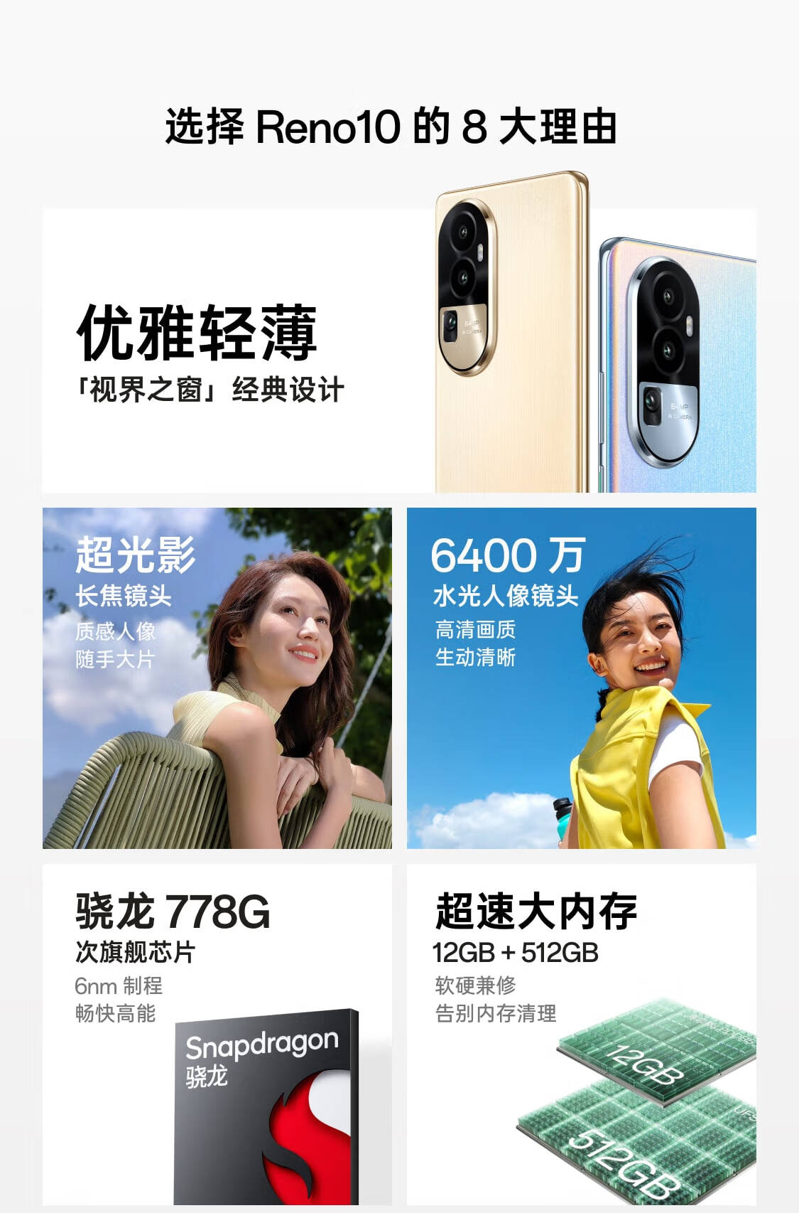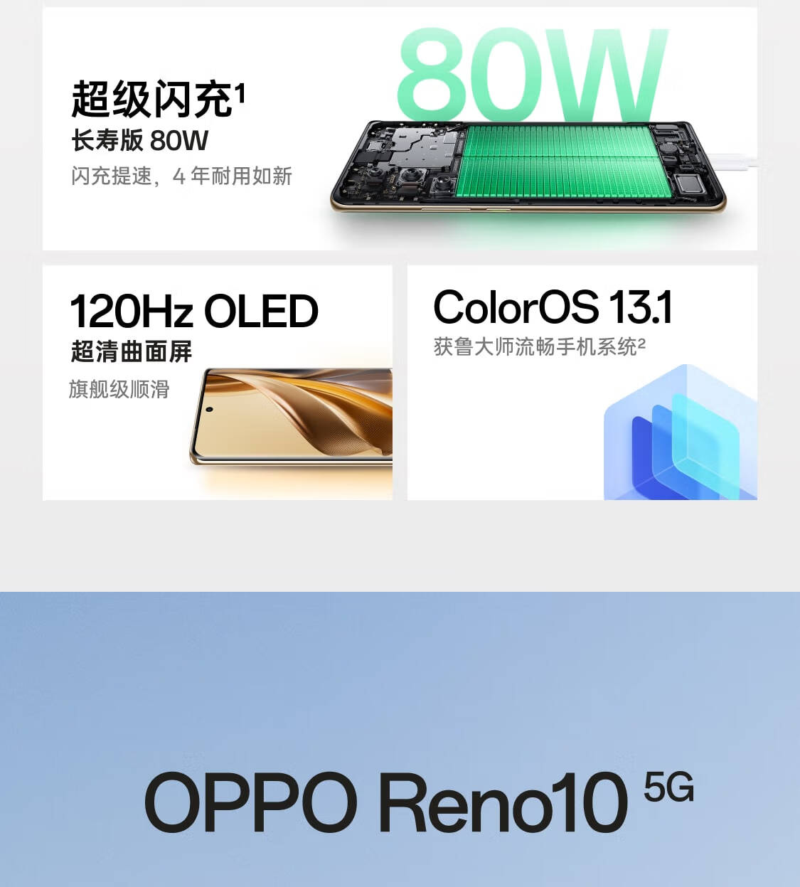 商品名称:OPPO Reno10 8GB+256GB 溢彩蓝 6400 万水光人像 超光影长焦镜头 80W超级闪充 120Hz OLED 超清曲面屏 5G手机
