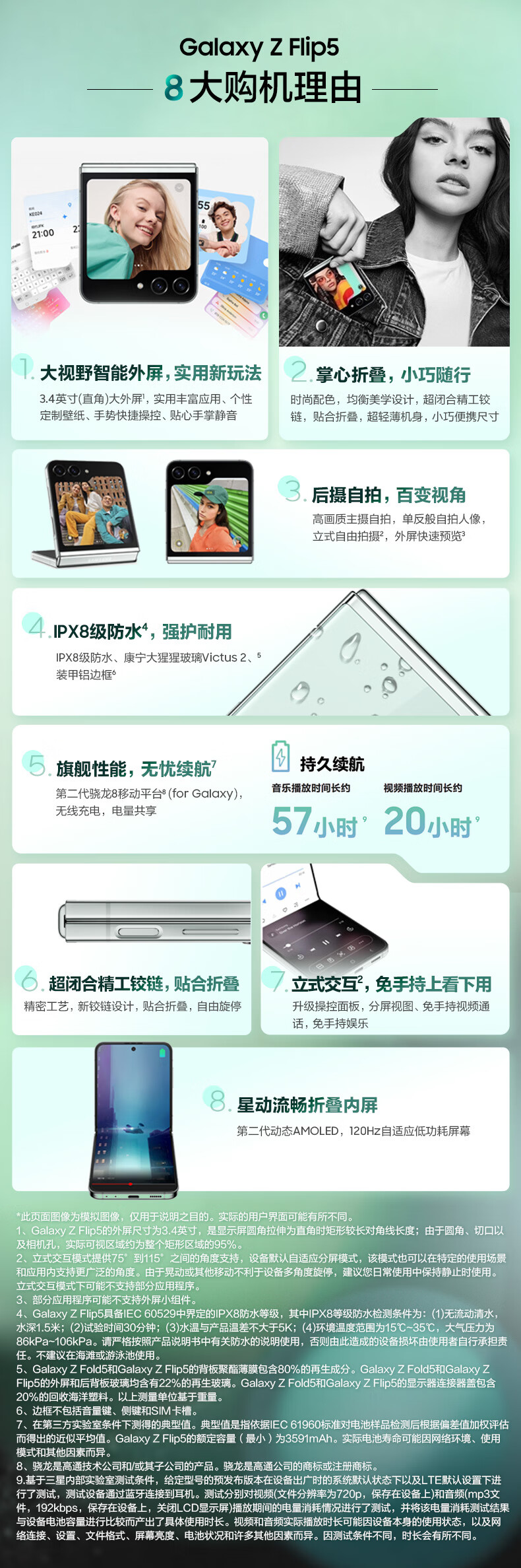 商品名称:三星 SAMSUNG Galaxy Z Flip5 大视野外屏 掌心折叠 5G折叠手机 8GB+512GB 冰薄荷