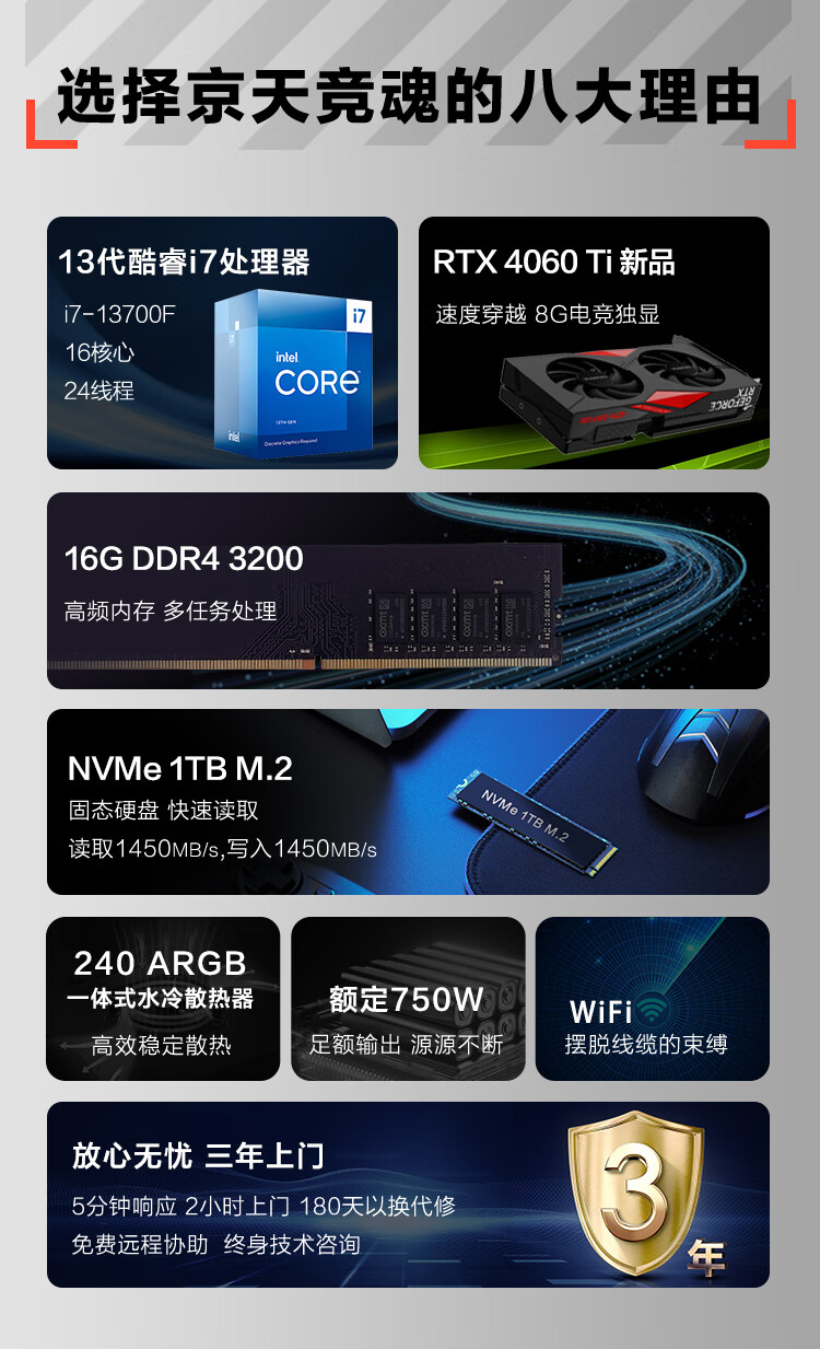 商品名称:京天(KOTIN) 竞魂13代i7设计师水冷电竞游戏台式电脑主机(i7-13700F 16G RTX4060Ti 1TB SSD WiFi )